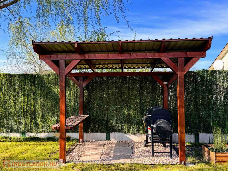 Tágas, parkosított kert 725 m²-en, egy fedett terasszal (17,93 m²), fa fedésű kerti pihenővel és grillezőrésszel.