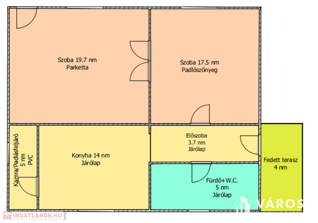 Helyiségei: 2 szoba, előszoba, fürdőszoba, konyha, kamra/padlásfeljáró, az alsó szinten 10 nm-es pince.