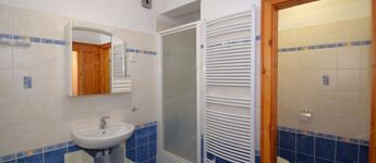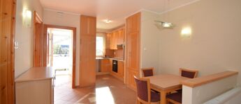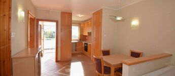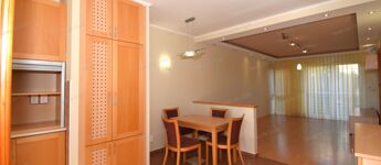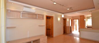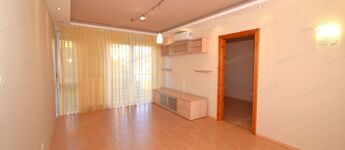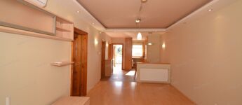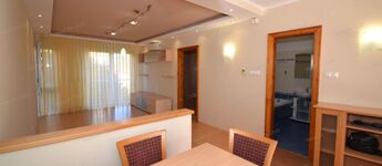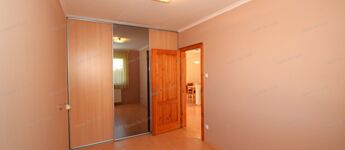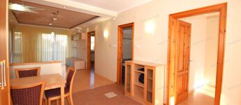 Elosztása: előszoba, konyha étkezővel, nappali, fürdőszoba zuhanyzóval, káddal és WC-vel és két hálószoba.  Az egyik hálószobában és az előszobában is nagy beépített szekrények segítik a tárolást. A lakás vételár része a fotókon látható nappali bútor és komód. Nappali fölött álmennyezet látható beépített spotlámpákkal.