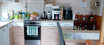 A hátsó lakrész ideális lehet albérlet kiadására, generációk együttélésére ,bármilyen tevékenységre, esetleg irodának. Ez a rész felújítandó, igény szerint ,de lakható is jelenleg tárolóként funkcionál. A lakrész elosztása: