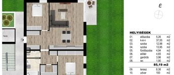 A 110 m²-es telek parkosított udvarral és kertrésszel rendelkezik, ahol a zöldövezet nyugodt hangulata garantált pihenést kínál. A terasz kiváló lehetőséget nyújt a szabadtéri kikapcsolódásra. Az elektromos garázskapuval felszerelt garázsban biztonságosan tárolhatók a gépjárművek, míg a kertvilágítás esténként varázslatos légkört teremt.