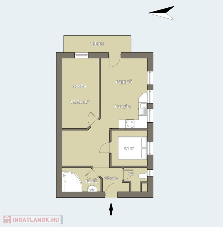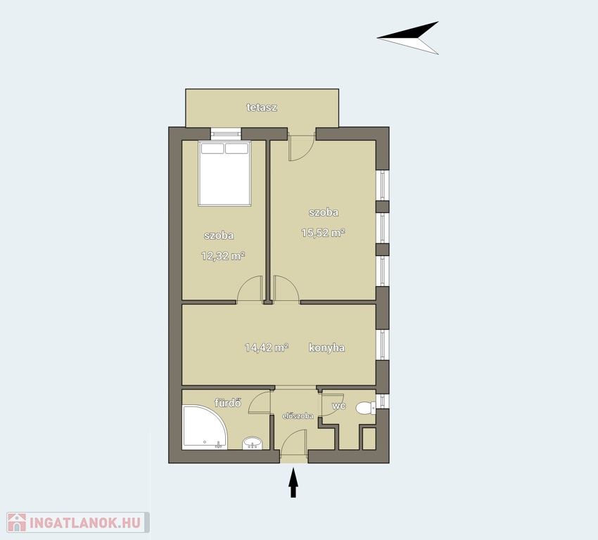 - előszoba, 2 szoba, konyha, étkező, fürdő, Wc, terasz 4 nm