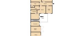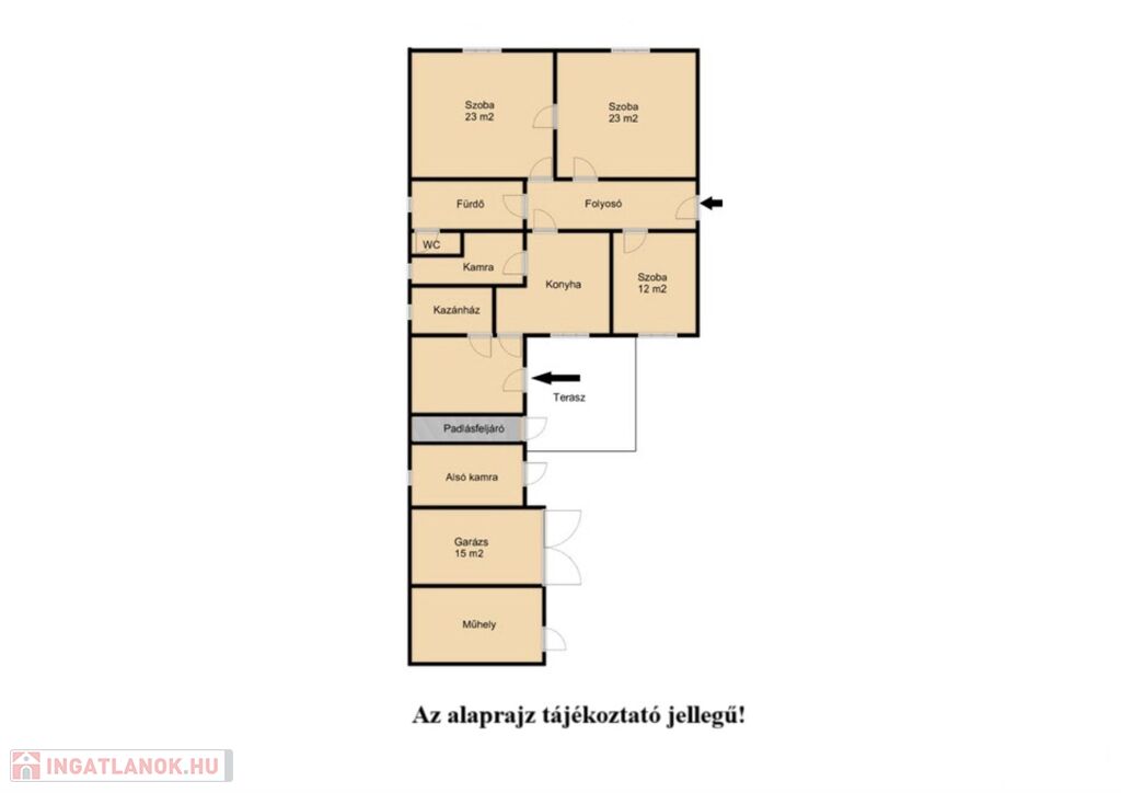 A ház elrendezése kifogástalan, mivel két bejárattal is rendelkezik valamint két szoba külön nyílik, de középső ajtó által is átjárható.