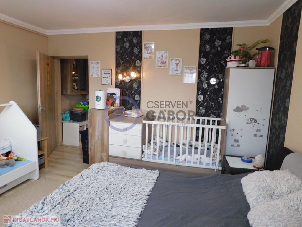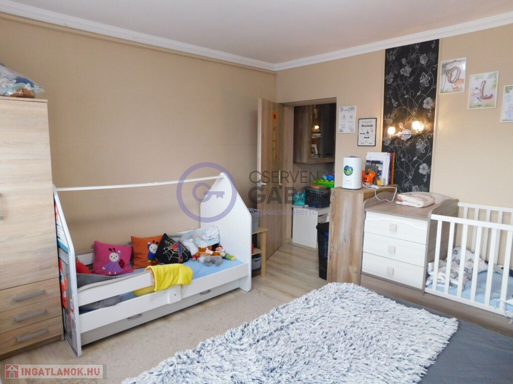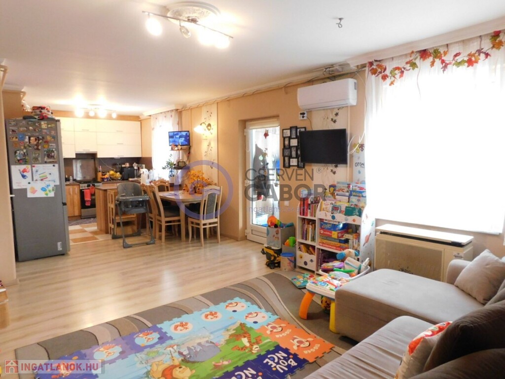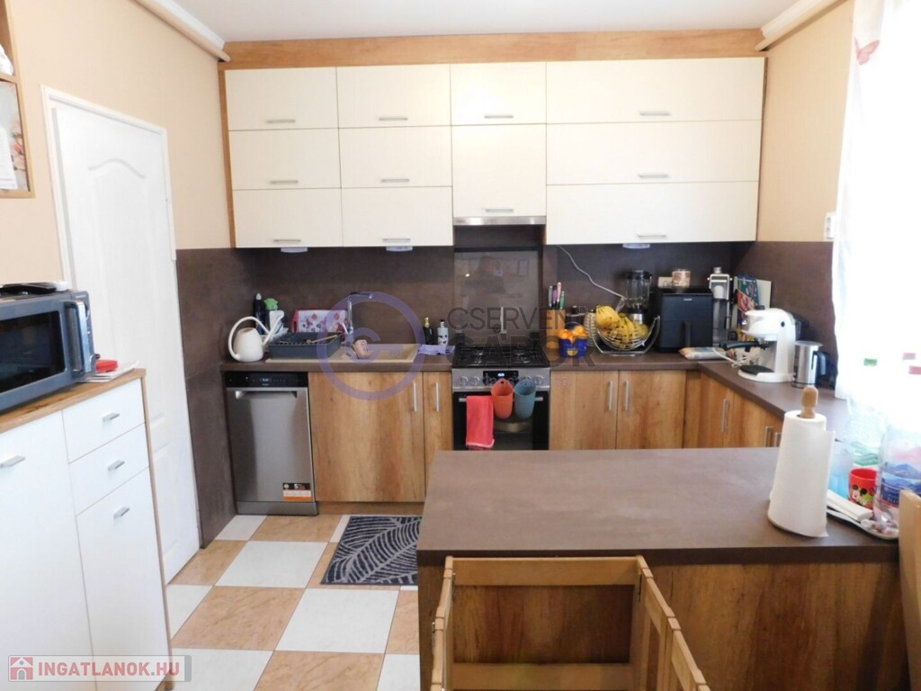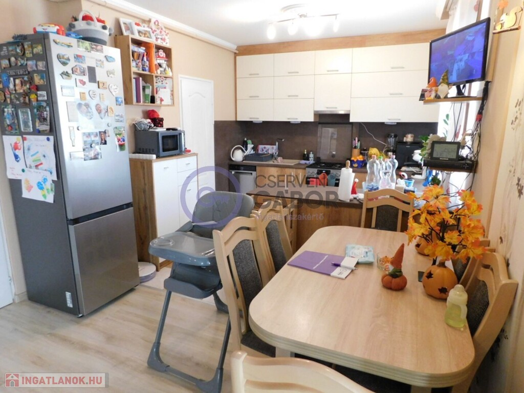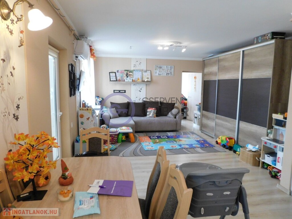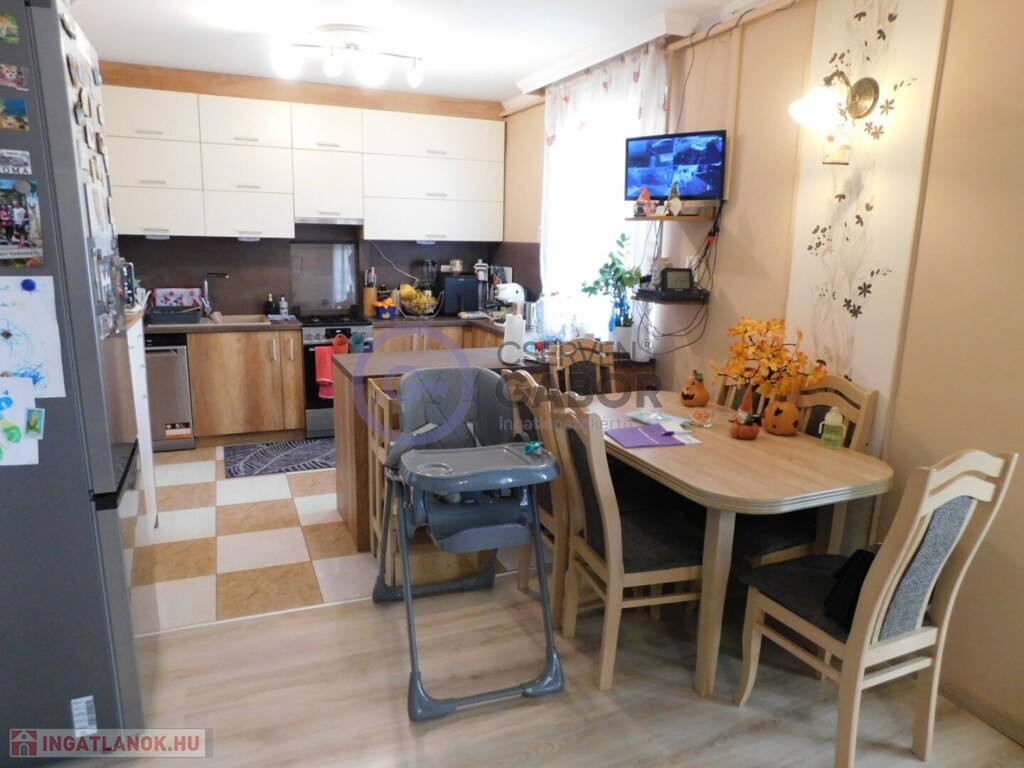 A lakóház az 1980-as években épült, tégla falazattal, cseréptetős fedéssel, és a későbbiekben alakították át ikerházzá. Az eladásra kínált ikerházfél 58 m2-es praktikus kialakítású lakóterülettel rendelkezik, ami egy kimondottan nagyméretű szobából, egy tágas, amerikai konyhás nappaliból, fürdőből, külön WC-ből, és egy előszobából áll. A szoba méretének és az ablakok elhelyezkedésének köszönhetően, akár két hálószobává is könnyedén megosztható.