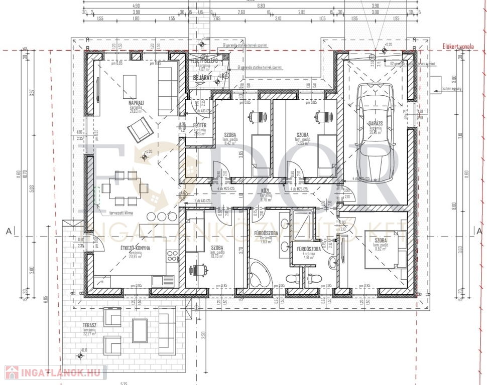 A ház stabil, 30 cm-es Porotherm téglafallal és 15 cm hőszigeteléssel készül, amelyhez modern, 3 rétegű műanyag nyílászárók, redőnyök, szúnyoghálók és párkányok tartoznak.