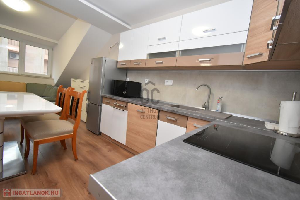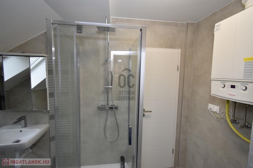 A tetőtéri lakrész 82 m2-es, ahol nappali + konyha + étkező, 2 db szoba, 2 db fürdő + WC, előszoba, tároló helyezkedik el.