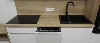 A teljesen felszerelt konyha és a beépített szekrények praktikus helykihasználást biztosítanak.