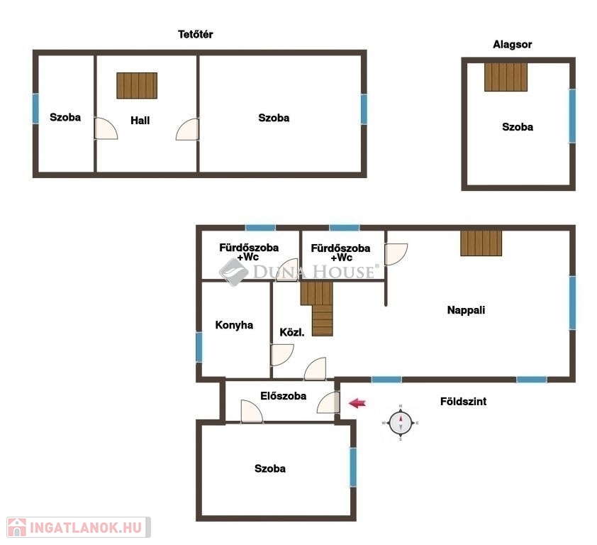 Az ingatlan több szintes kilakítású. Fő szintjén egy hatalmas nappaliszoba, egy ablakos konyha, egy további hálószoba, két füdőszoba+wc, és egy előszoba helyiségek találhatóak. Mivel a ház domboldalban épült, így a nappali alatti részen szuterén került kilakításra, ahol még egy további, tágas szoba kapott helyet, nagy méretű ablakkal, kellemes fényviszonnyal. A ház tetőtere szintén beépítésre került, itt egy hallból két külön bejáratú hálószoba nyílik.