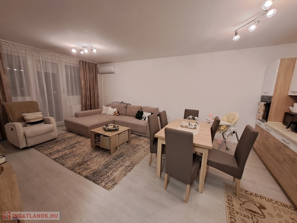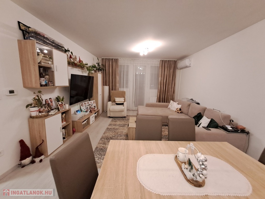 A lakás Ytong falazatú, szigetelt épületben helyezkedik el, egyedi gázfűtéssel, műanyag nyílászárókkal és redőnyökkel felszerelve. A gépesített, beépített konyhabútor a mindennapok praktikus része, a hűtő-fűtő klíma pedig tovább növeli a komfortot. A burkolatok a járólap és laminált padló váltakozásával esztétikus összhatást adnak, a fürdő és a WC külön helyiségben kapott helyet. A társasházban közös tároló is a lakók rendelkezésére áll.