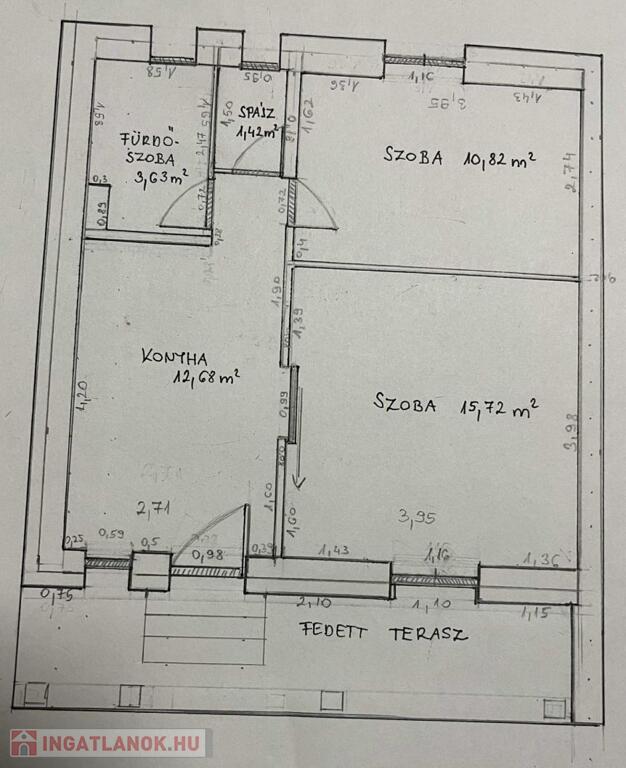 - 2 szoba / 15,7nm, 10,82nm / konyha 12,68 nm, fürdőszoba 3,63 nm, kamra 1,43 nm..