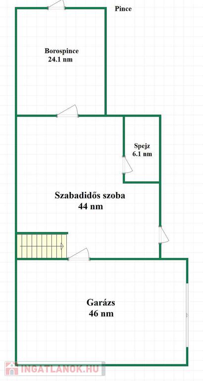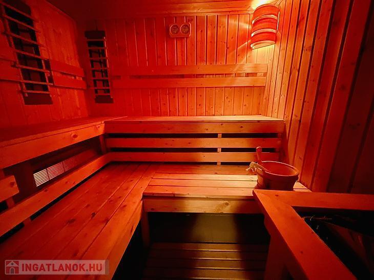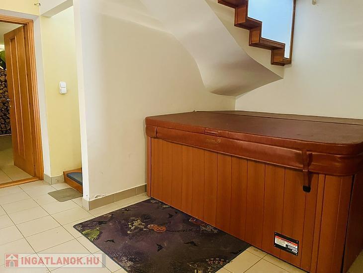 Elosztását tekintve az alsó szint szabadidős tevékenységre lett kialakítva, amely tartalmaz egy hangulatos borospincét, egy szaunát, illetve egy nagy teret melyet egyénre lehet szabni melyben elhelyezésre került egy jacuzzi. Továbbá elektromos kapun keresztül juthatunk be a 4 állásos fűtött garázsba.