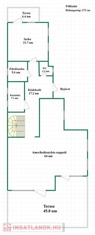 A középső szinten egy tágas amerikai konyhás nappali egy előszoba, mosókonyha, hálószoba, fürdőszoba és egy külön WC kapott helyet.