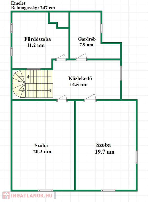 Az emeleten egy előtér, 2 hálószoba egy gardróbszoba és egy fürdőszoba került kialakításra.