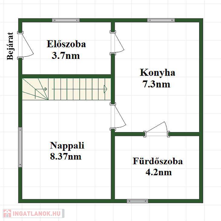Alsó szint: előszoba, nappali, konyha, fürdőszoba