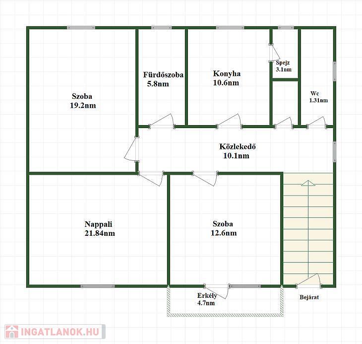 A ház 4 szobából áll, melyek közül az egyikhez erkély is kapcsolódik. A jól átgondolt elosztásnak köszönhetően találunk benne konyhát, étkezőt, 2 fürdőszobát, valamint külön WC-t is, így nagyobb család számára is kényelmes otthont biztosít.