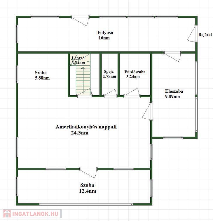 Az alsó szinten tágas előszoba, közlekedő, amerikai konyhás nappali, egy külön szoba, fürdőszoba és spejz található.