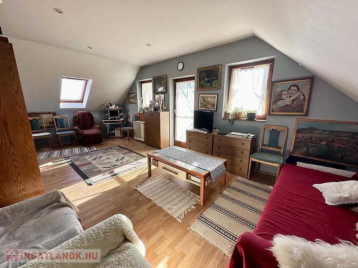 A felső szint egy hangulatos nappalit, egy hálószobát, fürdőszobát és egy erkélyt rejt, ahonnan lélegzetelállító panoráma nyílik a városra és a környező tájra. Délkeleti fekvése miatt a ház egész nap napfényben fürdik, így mindig világos és tágas tereket biztosít.