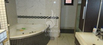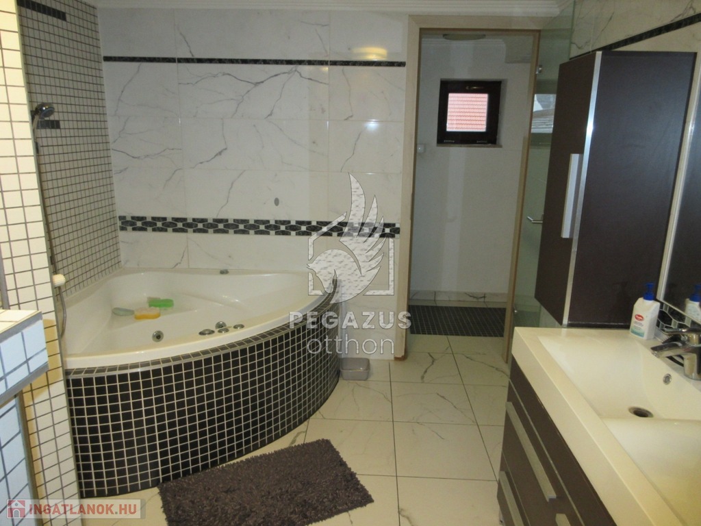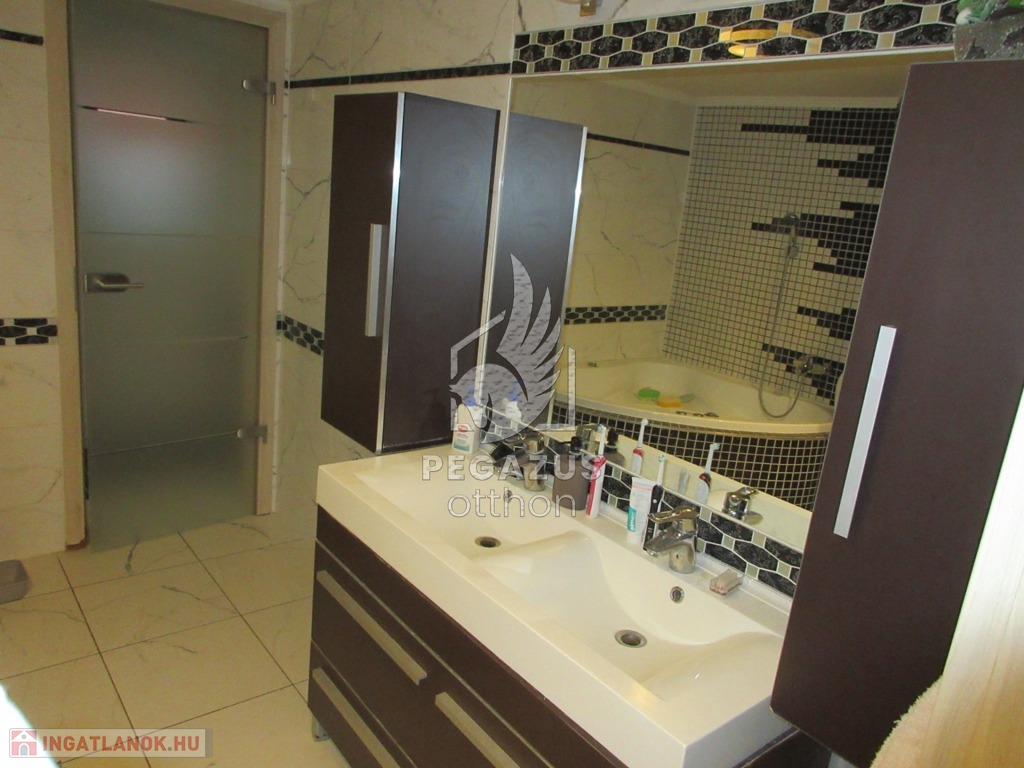 Fürdő: Kádas és zuhanyzós megoldás ikermosdóval, külön mosókonyha és toalett.