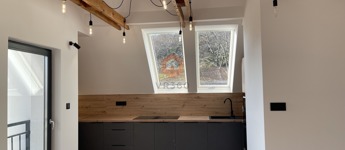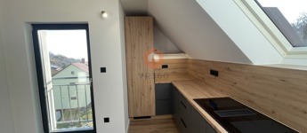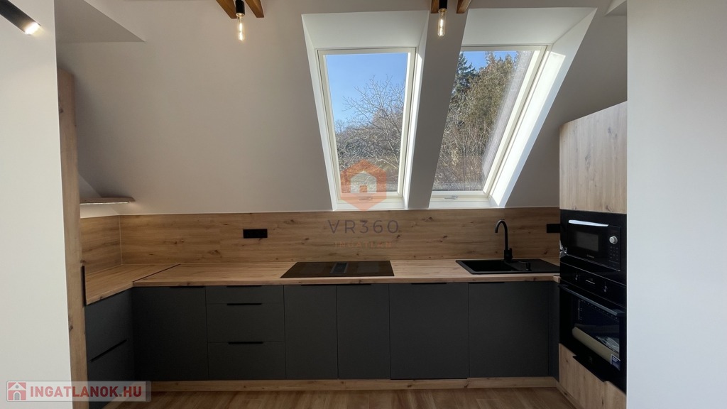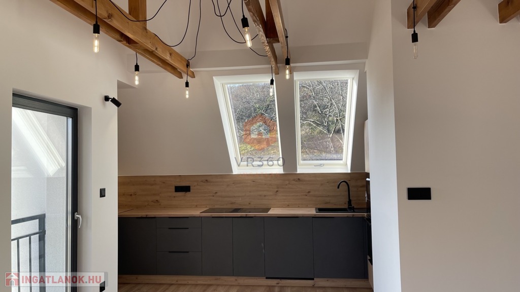 -teljesen gépesített amerikai konyhás nappali, beépített sütő, indukciós főzőlap, elszívó, beépített hűtő, mosogatógép, az amerikai konyhás nappali különlegessége a 2 db egymás mellett elhelyezkedő tető erkély