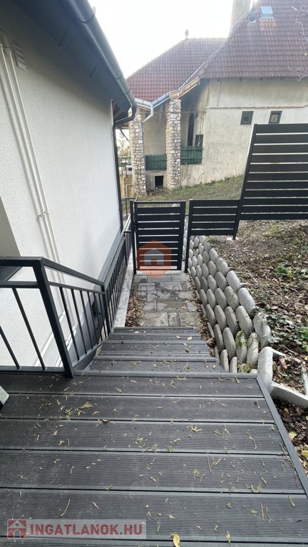 A nagyméretű teraszról minőségi tömör fa lépcsőn juthatunk fel a lakószintre.