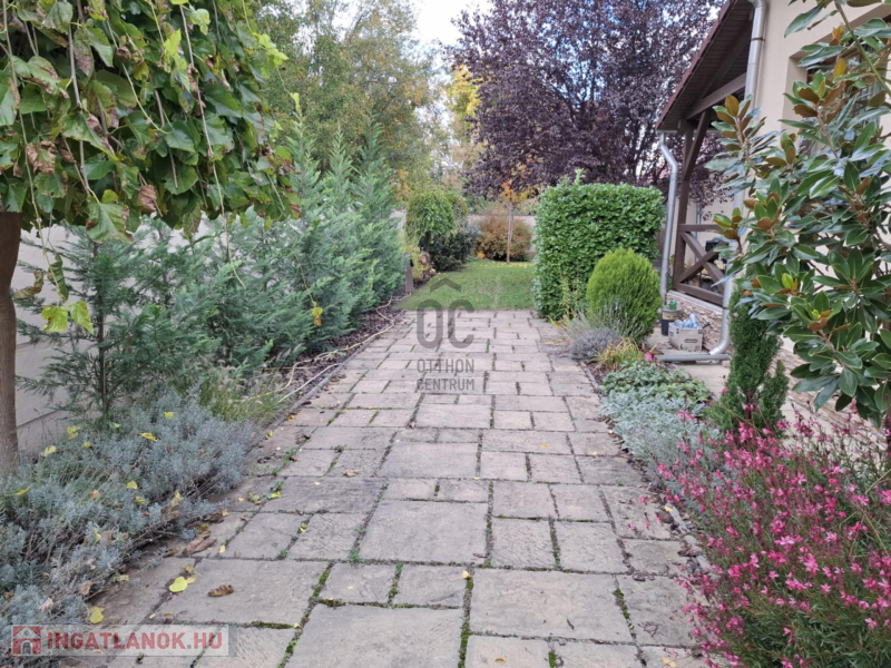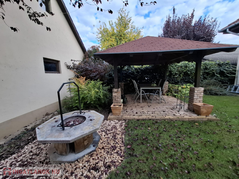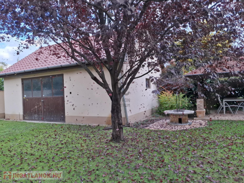 A családi házhoz tartozik egy nagyméretű, rendezett, parkosított kert . A kert végén helyezkedik el a szerelőaknás duplagarázs tárolóval, a kettő együtt összesen 44 nm nagyságú. A kertben helyet kapott egy filagória és egy sütőhely is.