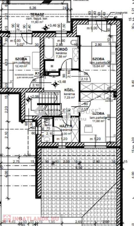 3 hálószoba (12,40, 15,64, 11,60), fürdőszoba, háztartási helyiség, emeleti terasz.