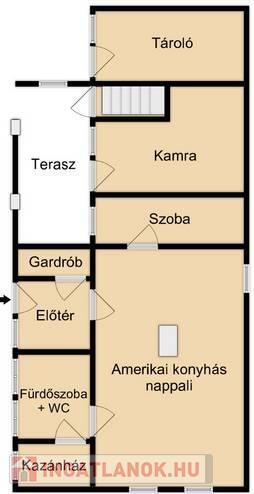 - A házban amerikai konyhás nappali, szoba, kamra kapott helyet, melyeknek belmagassága 2,2 méter.