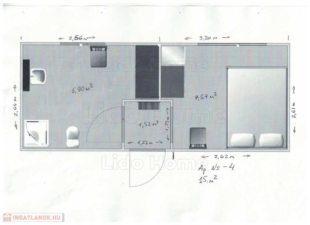 - apartman 3 (2 fő részére): 1 hálószoba, nappali-konyha-étkező, fürdőszoba zuhanyzóval+WC
