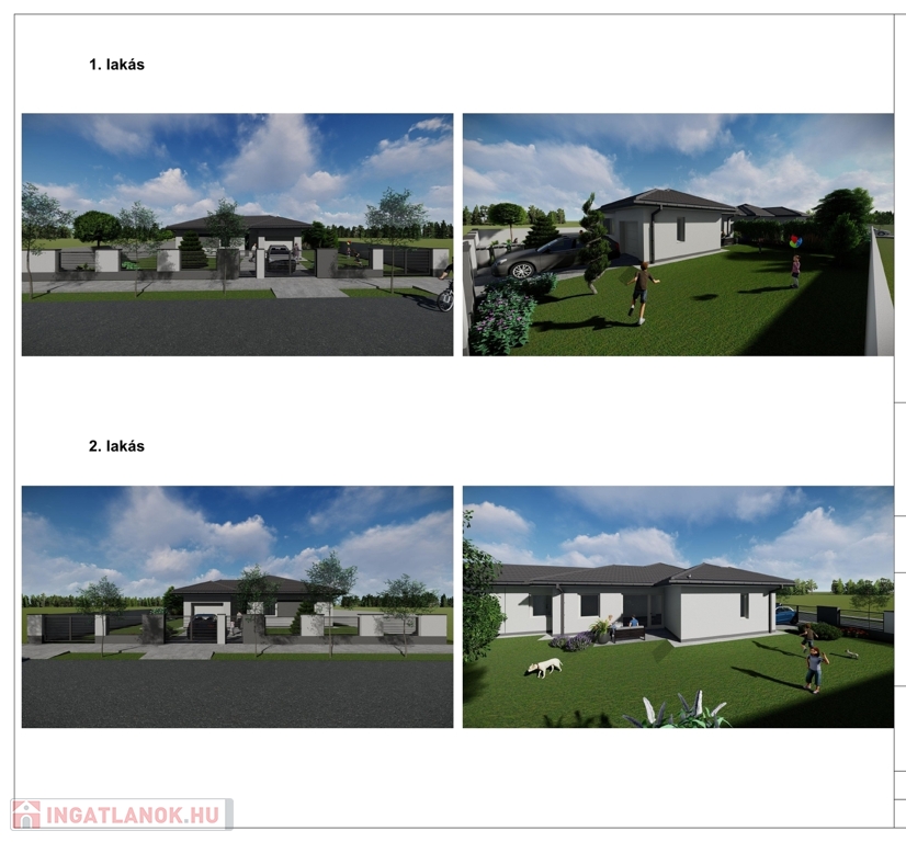 2 ingatlan: 107,21 nm. Nappali, Étkező, Konyha + 3 szoba. Az ingatlan össznégyzetméteréhez tartozik egy 16,20 nm-es garázs.