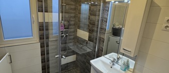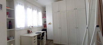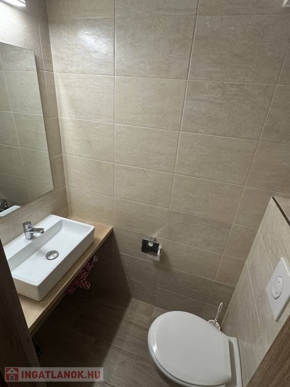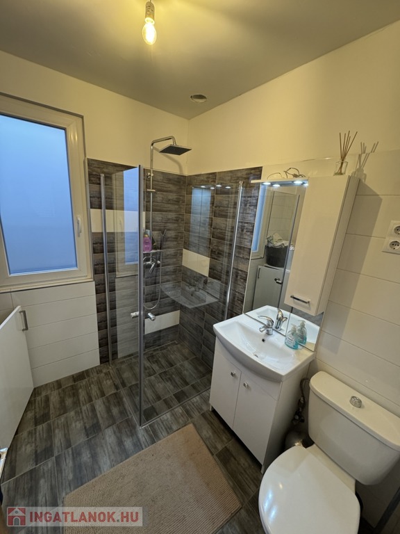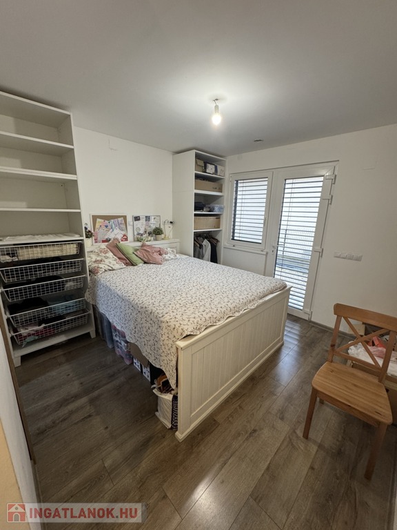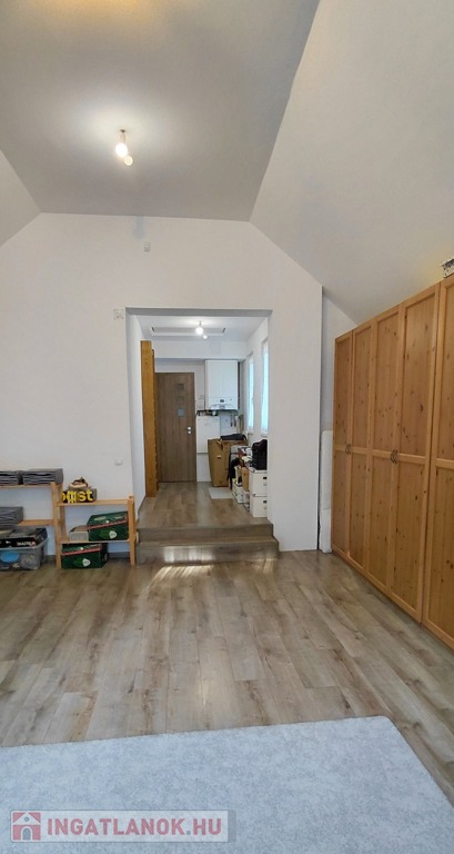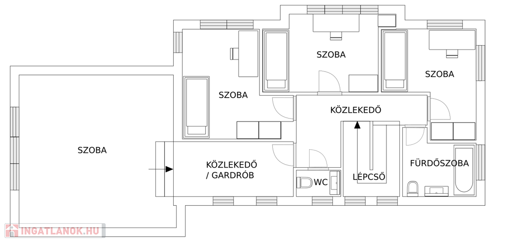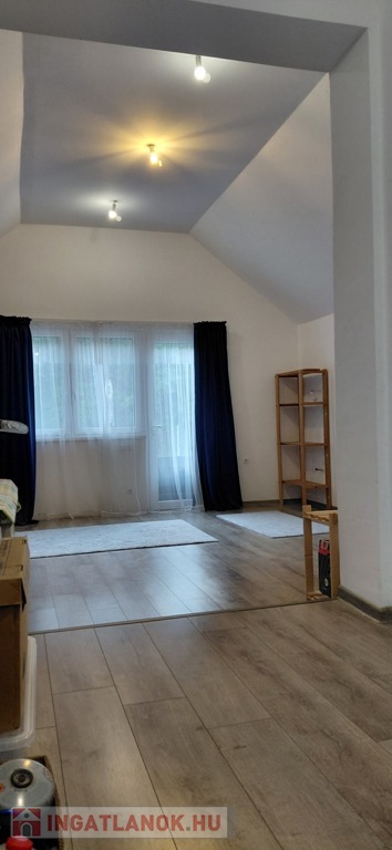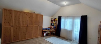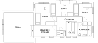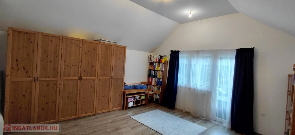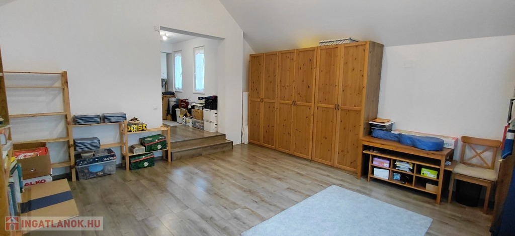 -az emeleten (77nm): három hálószoba egy fürdő-WC (itt még burkolás szükséges) és egy külön Wc került kialakításra. Ezen kívül egy gardróbon keresztül egy 26 nm-es vendégszoba található, mely külön lakrészként is használható.