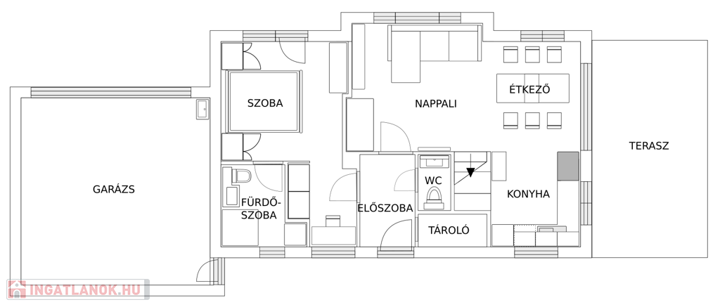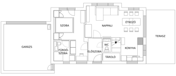 -földszinten (80nm) egy konyha-étkező-nappali, az előszobából egy vendég WC nyílik, hálószoba saját fürdővel, gardróbbal ill. egy tároló található. A nappaliból léphetünk ki a 20 nm-es mészkő borítású, fedett teraszra. A terasz előtt egy medence felállítására is van lehetőség.