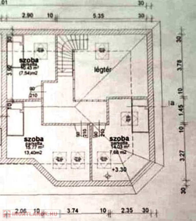 szoba 13,4m2, szoba 7,7m2, szoba 7,6m2, közlekedő-előtér 12m2, mosdó-zuhanyzó 7,15m2, toalett 2,64m2, gardrób 12,76m2;