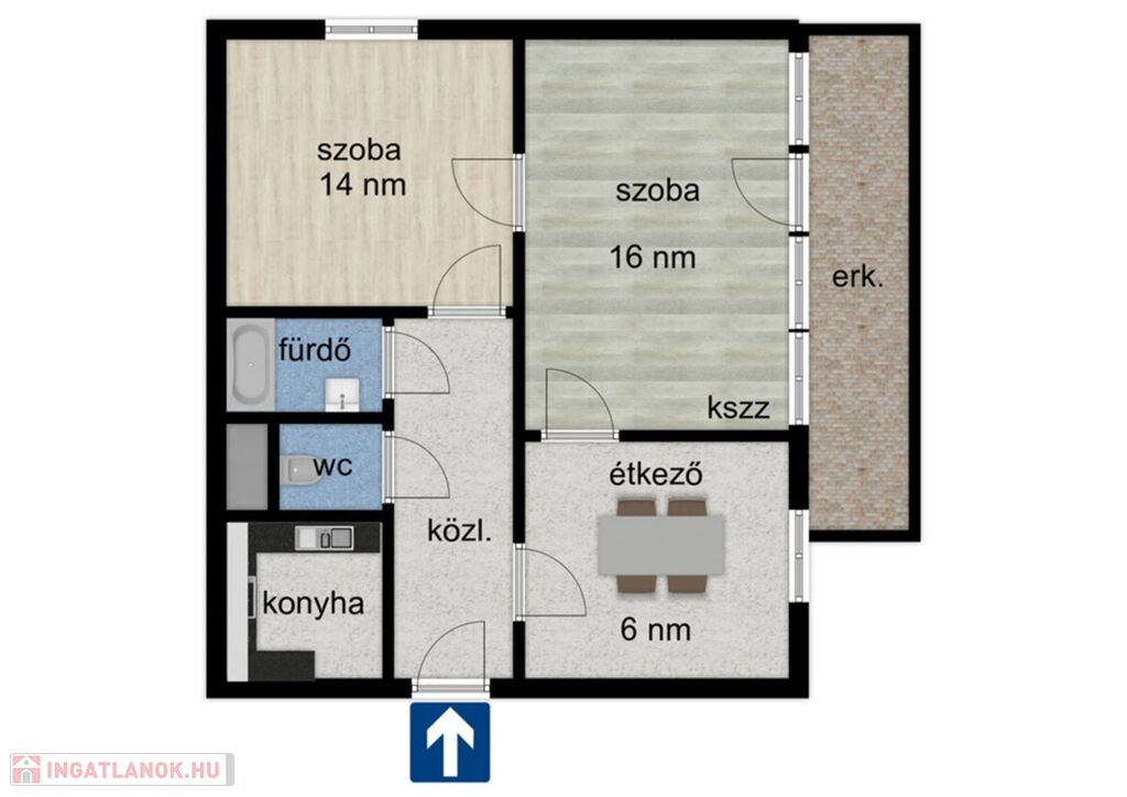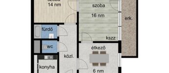 - Nappali, konyha, szoba, étkező,WC, fürdő, erkély, közlekedő.