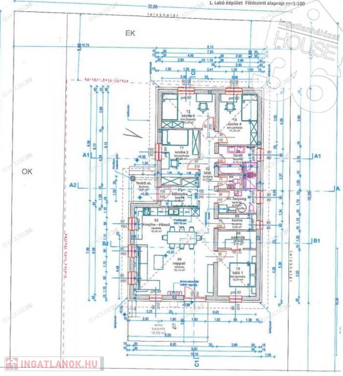 előszoba (5,15 m2), közlekedő (6,77 m2), WC (1,8 m2), fürdő (6,15 m2), Ht helyiség (6,04 m2), gardrób(3,77 m2) konyha + étkező (16,46 m2), nappali (23,14 m2), kamra (3,46 m2), szoba1(10,31 m2), szoba2 (10,09 m2), szoba3 (10,42 m2), szoba4 (11,19 m2)