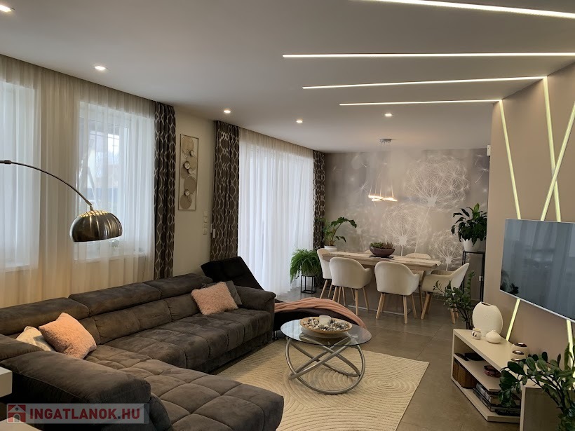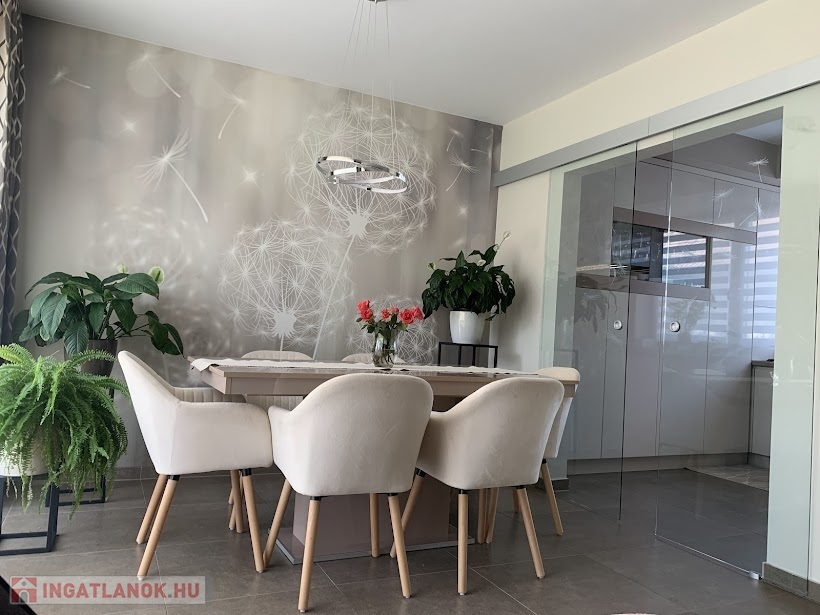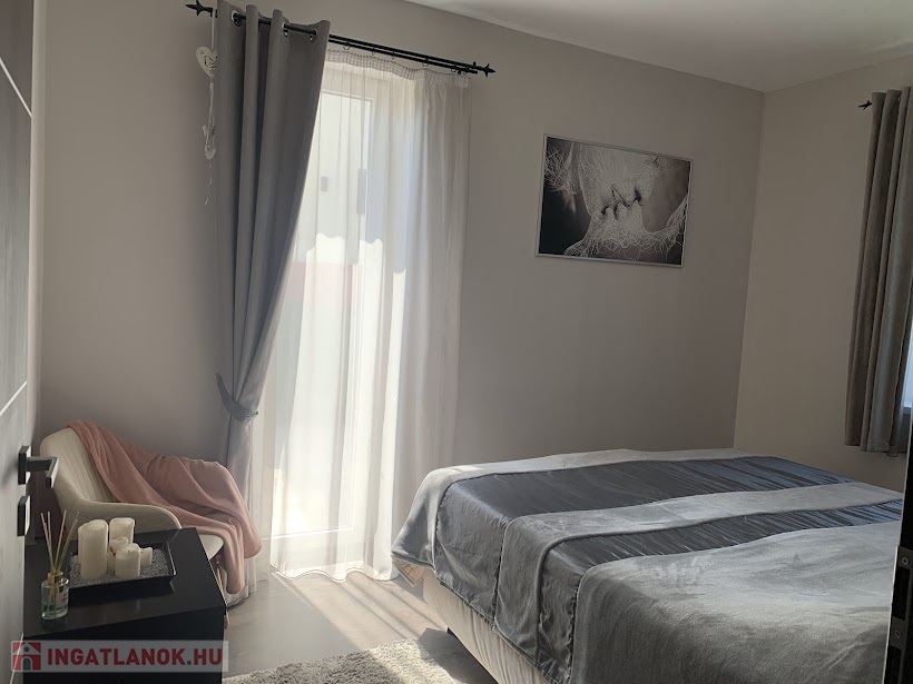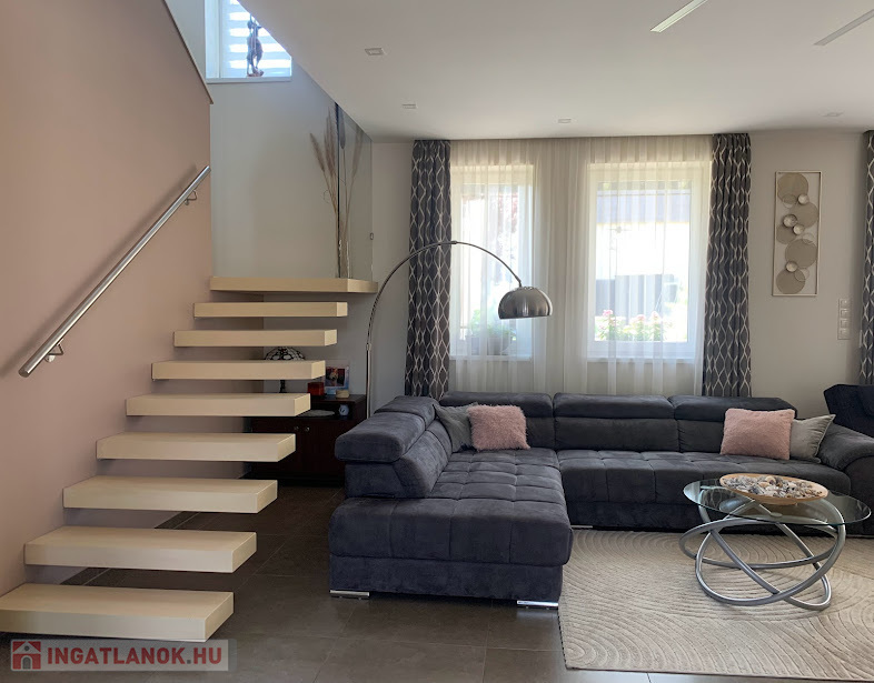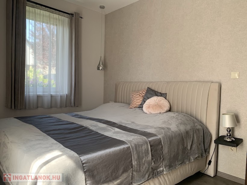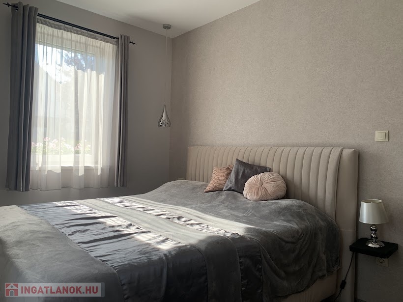 A 2018-ban épült, modern, minimalista stílusú főépület nettó 140 m² alapterületű, kétszintes kialakítású.Elrendezése: nappali + 4 hálószoba.Padlófűtéssel, 5 kW-os, szaldós elszámolású napelemes rendszerrel, elektromos redőnyökkel és egy 30 m²-es fedett terasszal rendelkezik.A kiváló szigetelésnek és korszerű gépészetnek köszönhetően a fenntartási költsége rendkívül alacsony.