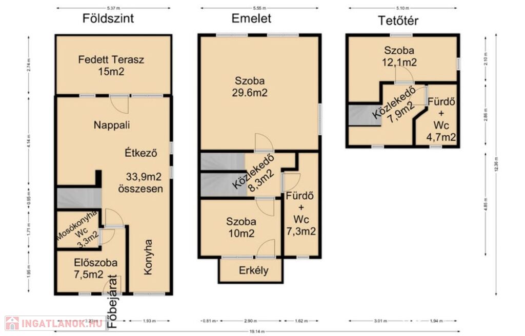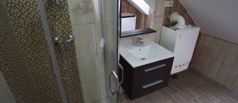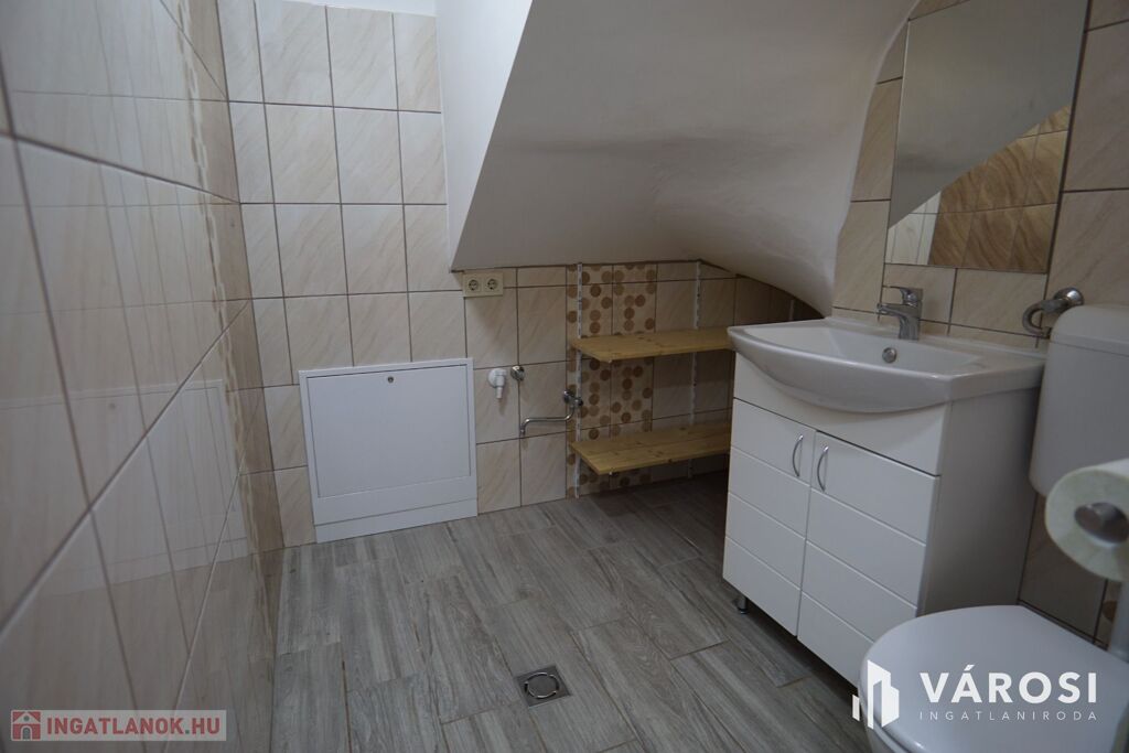 Tetőér: közlekedő, szoba, zuhanyzós fürdő mellékhelységgel együtt.
