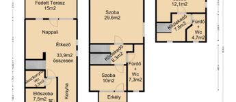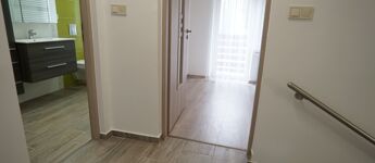 Emeleti szint: közlekedő, szoba erkélykapcsolattal, nagy szoba (igény szerint 2 szobára alakítható), zuhanyzós kádas fürdő mellékhelységgel együtt.