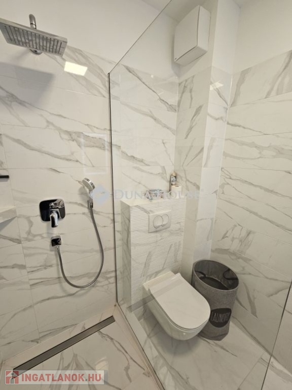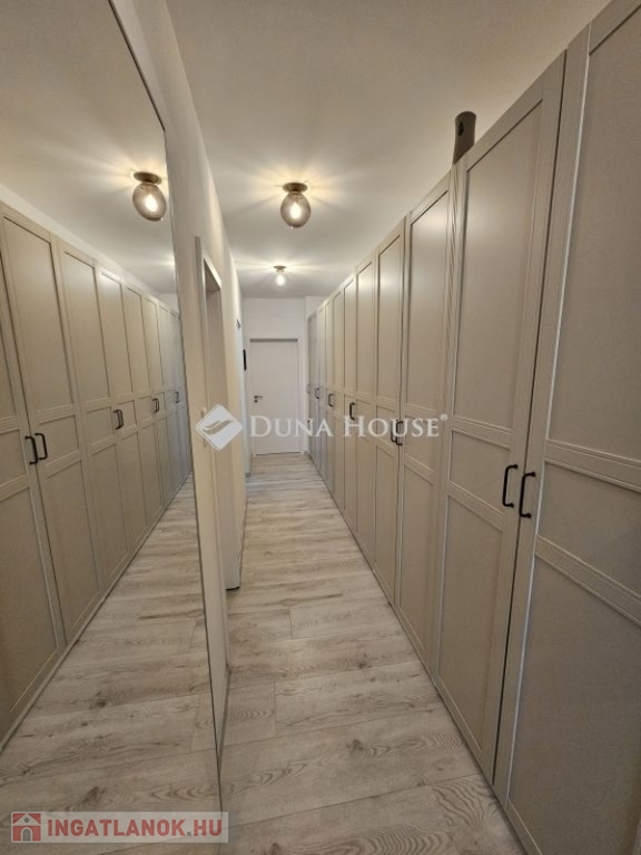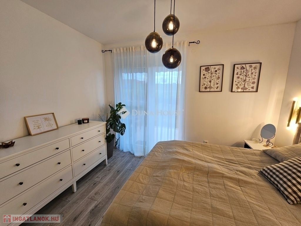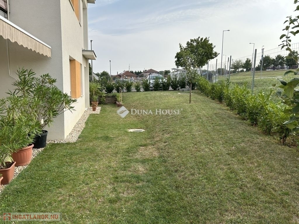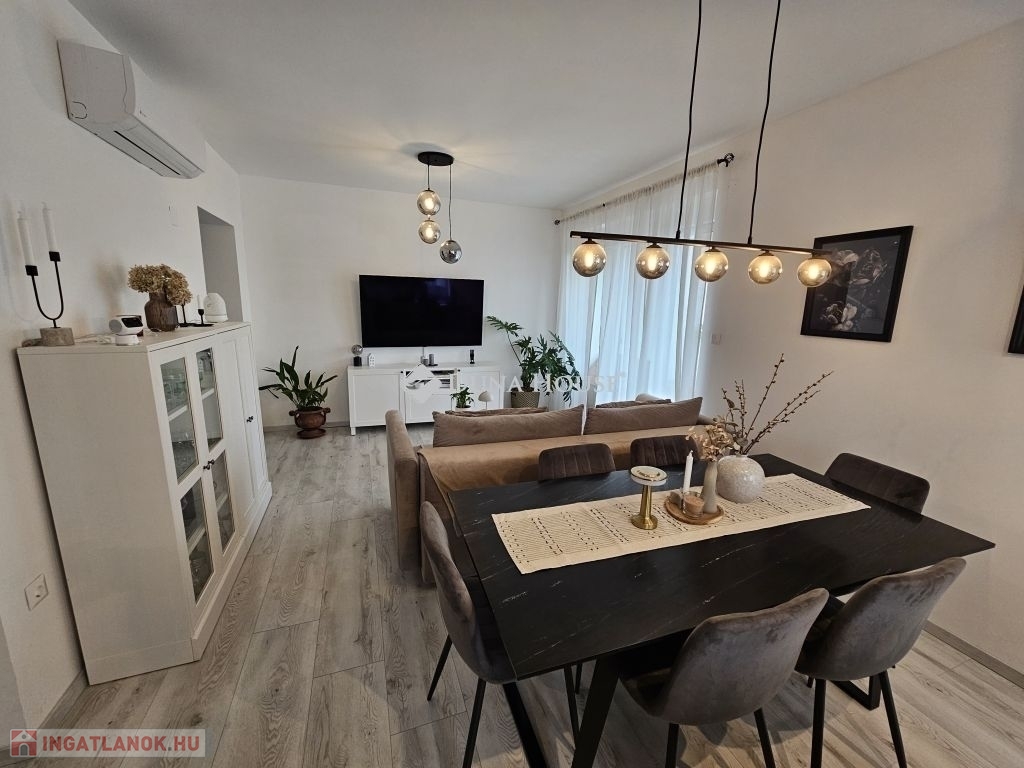 Kertkapcsolat és extra területek. A lakáshoz tartozik egy 240 m²-es kizárólagos használatú, parkosított kert, benne egy könnyűszerkezetes, 10 m²-es kisházzal ideális tárolónak vagy hobbihelyiségnek. Két kényelmes terasz, mindkettő beépített, kinyitható árnyékolóval. A kertből kiskapun keresztül is eljuthatunk a két autóbeállóhoz, melyek közvetlenül a lakás előtt helyezkednek el. Belső elrendezés 3 hálószoba Tágas nappali-konyha-étkező egy légtérben 2 igényes fürdőszobaPrémium felszereltség FAP olasz hidegburkolatok Hansgrohe falba süllyesztett csaptelepek Blanco gránit mosogató és csaptelep a konyhában Minőségi német konyhabútor kompakt munkapulttal, konyhaszigettel Új, elektromos fehér alumínium redőnyök minden ablakon Hőszivattyús padlófűtés + fancoil hűtés a kellemes klímáért egész évben Alacsony rezsiköltségek, energiahatékony, és letisztult, igényes belső terek.