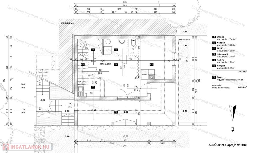 – Földszint: konyha, étkező, fürdőszoba, nappali (félszoba)