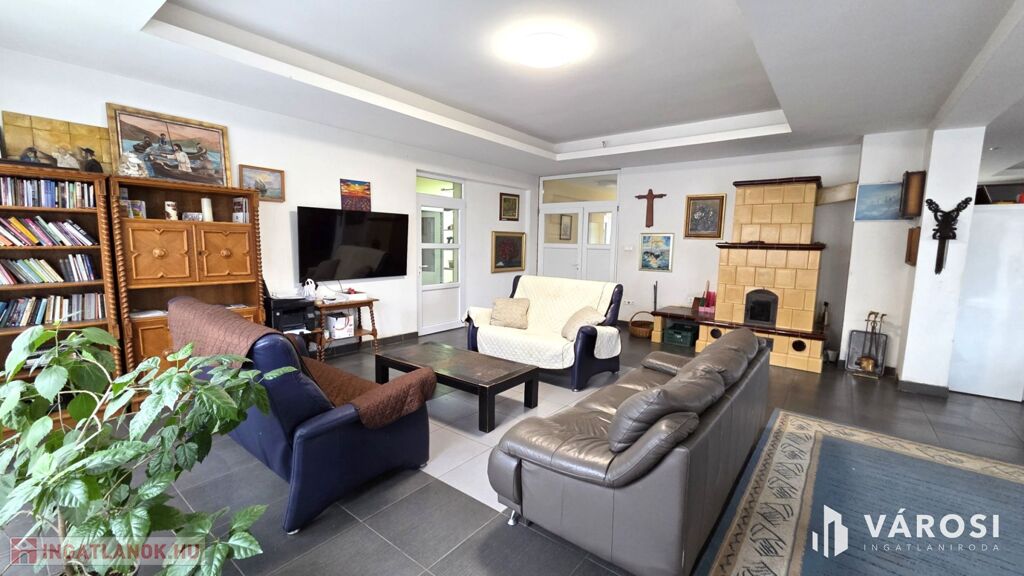 A ház szíve egy 92 m²-es amerikai konyhás nappali, hatalmas üvegfelületekkel, ahonnan a kert látványa tárul elénk. A nappaliban egy gyönyörű cserépkályha ad meghitt hangulatot – igazi közösségi tér, ahol a család apraja-nagyja könnyen együtt lehet.