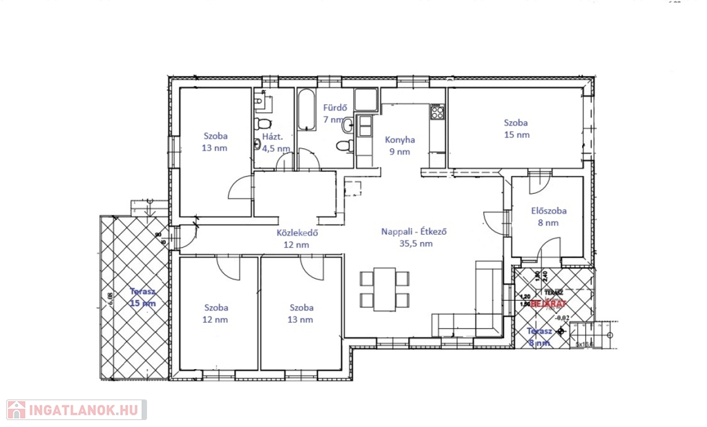 Elrendezése az alaprajz szerinti. Amerikai konyhás nappali, 4 hálószoba, 2 fürdőszoba, tágas előszoba és közlekedő található benne.