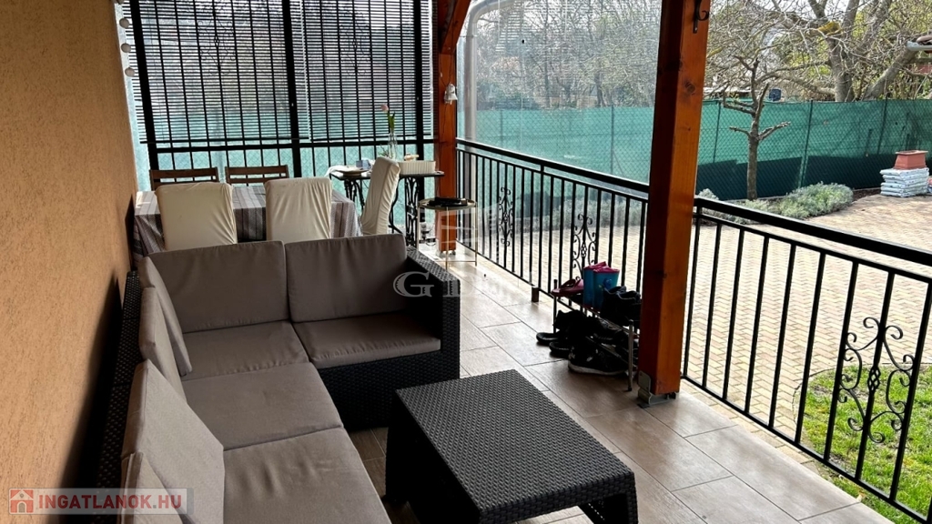 Hátul, a kert felé pedig egy kényelmes méretű, fedett terasz található.