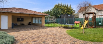 A kert parkosított része a pihenést szolgálja. Gyermekeknek játszótér, veteményes a kertészkedni vágyóknak, biztonságos környezet a kutyusoknak.