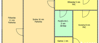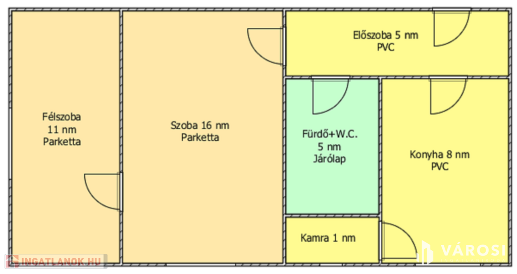 Helyiségei: 1 szoba, 1 félszoba, konyha, kamra, előszoba, fürdőszoba.