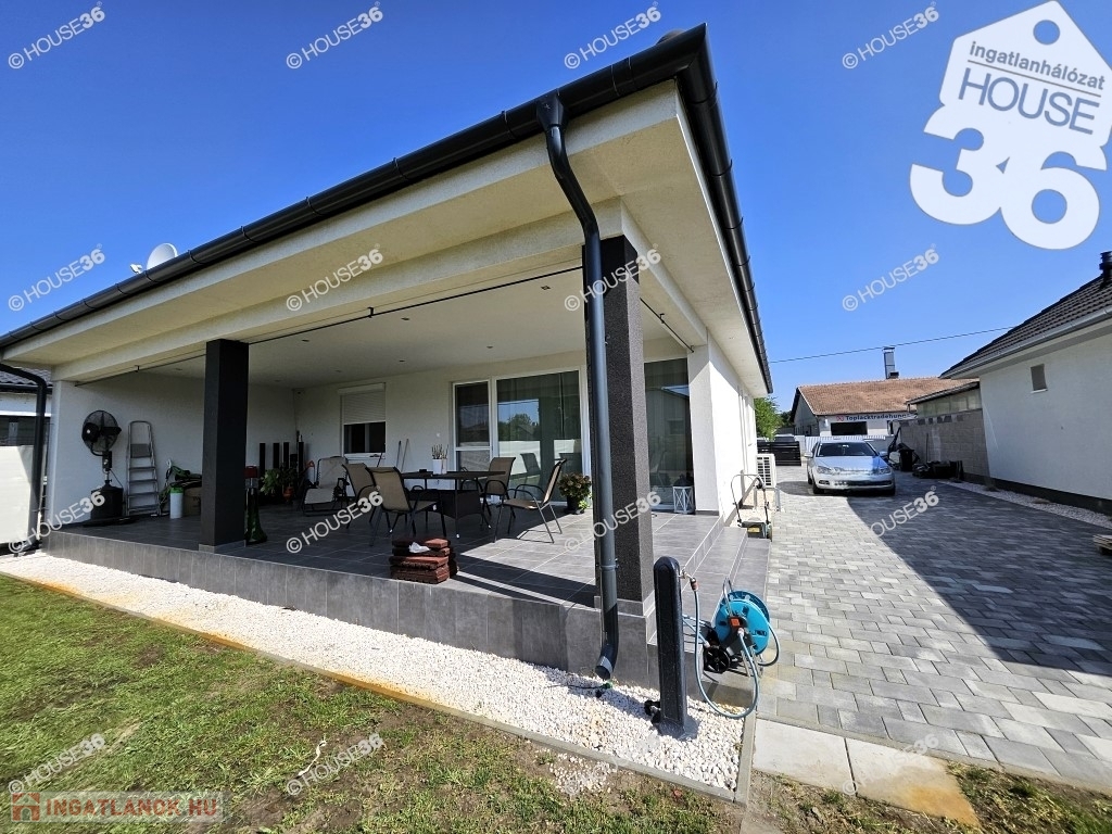 Kecskemét - Katonatelepen, új építésű, aszfaltozott utcában, 585 m2-es telken, br.142 m2-es (netto 123,6 m2-es), nappali + 2 lakosztályos (2 fürdő, 2 gardrób), családi ház, 41 m2-es fedett terasszal eladó! Kis átalakítással még egy szoba kialakítható, szükség esetén. Minőségi anyagokból, kiváló ízléssel épült!