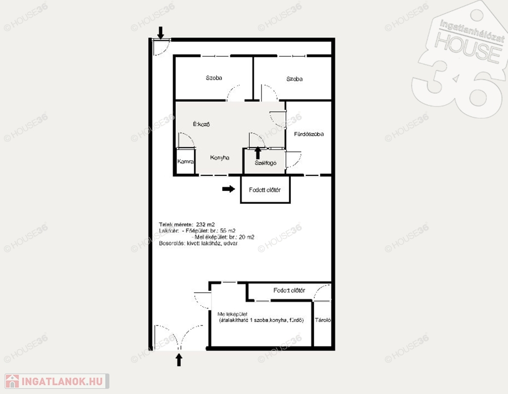 - Lakótér: Főépület: br.: 55 m2 (konyha+ étkező, kamra, 2 szoba, fürdőszoba)