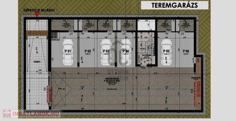 - A pinceszinten 6 db. gépkocsi beálló valamint önálló tárolóhelyiségek található