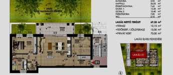 Földszint 1 lakás: 69.3 nm + 12.15 nm terasz + 15 nm zöld terasz + 70 nm privát kert