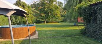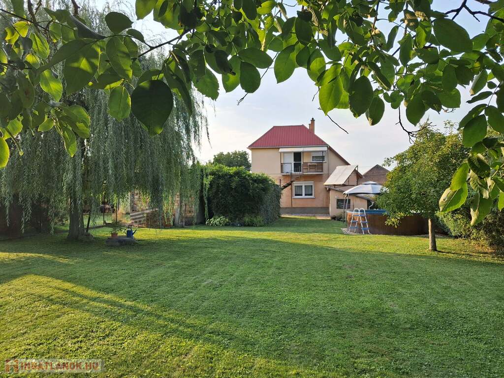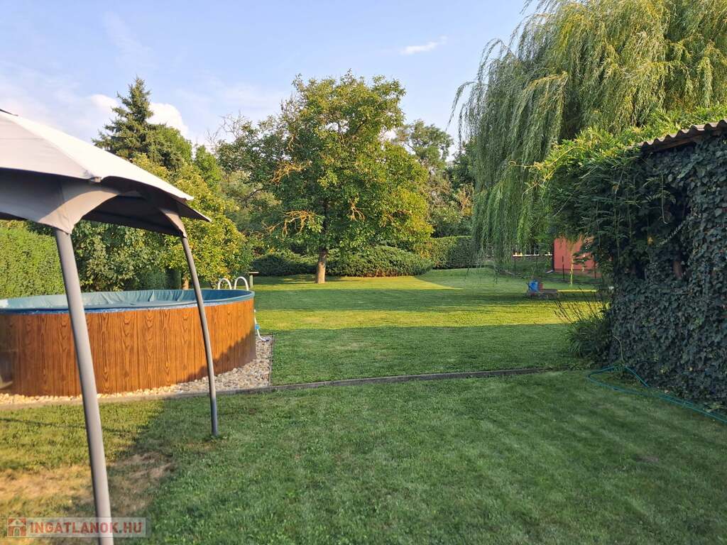 A gondozott, rendezett, nagy méretű, füvesített telek automata öntözőrendszerrel, gyűrűs kútról üzemeltethető. A telken két személyautó számára alkalmas téglaépítésű garázs van, mellette közel ugyanakkora, fapanelekből épített, fedett külső beállóval.