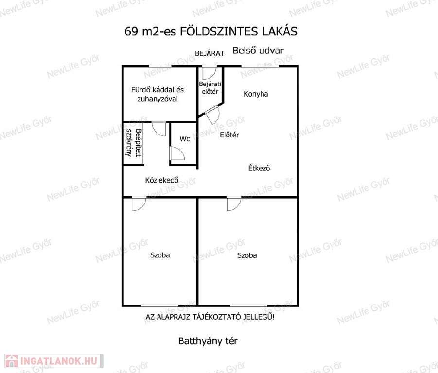 Győr belvárosának szívében, a Batthyány tér közvetlen közelében kínálom megvételre ezt a jó állapotú, azonnal költözhető, földszinti, 69 m²-es, nappali + 2 szobás téglalakást, amely ritka módon zöld, parkos területre néz minden ablaka, mégis minden karnyújtásnyira elérhető.